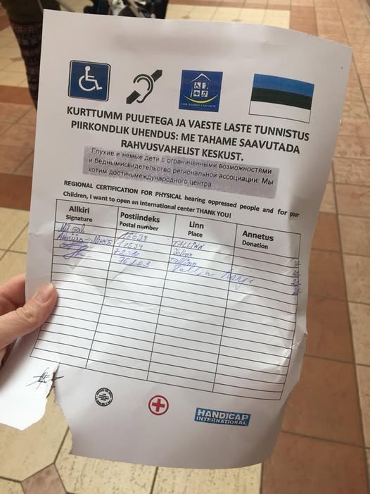 Kaubanduskeskuste juures on viimastel päevadel märgatud ebaausate kavatsustega inimesi, kes oma sõnul koguvad annetusi kuulmispuudega inimestele. ÄRGE ANNETAGE, vaid pöörduge kahtlasi annetuste kogujaid märgates politsei või turvateenistuse poole! Eesti Kurtide Liidul ega teistel puuetega inimeste organisatsioonidel ei ole annetuste kogujatega mingit seost! Fotol on näide võltsitud allkirjalehest, millega annetusi kogutakse.