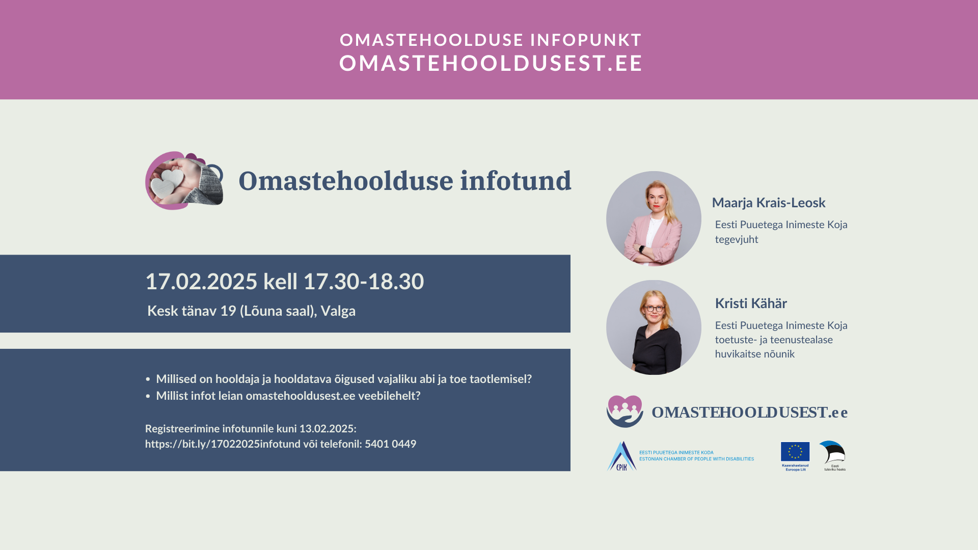 Eesti Puuetega Inimeste Koda kutsub kõiki huvilisi osalema omastehoolduse infotunnil 17.02.2025 kell 17.30-18.30 Kesk tänav 19 (Lõuna saal), Valga