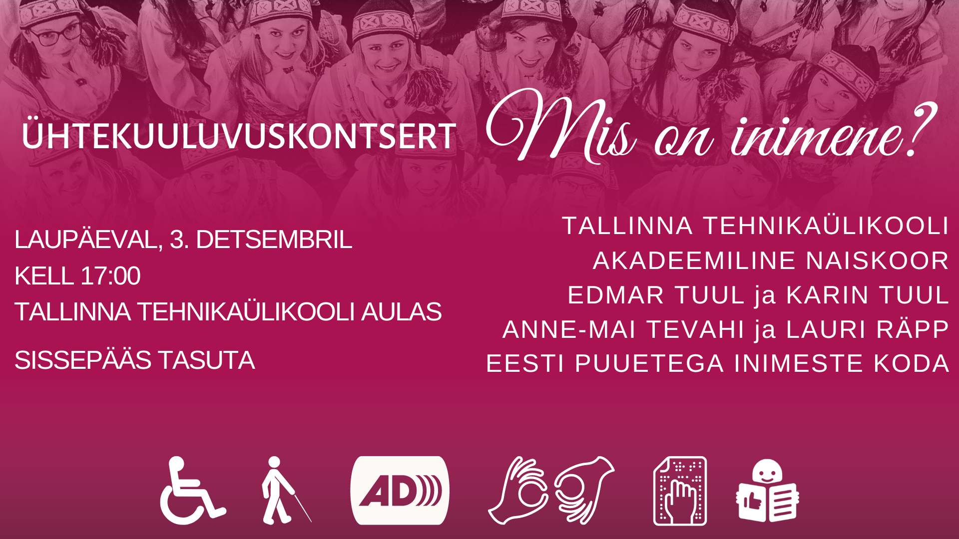 Ootame teid 3. detsembril kell 17.00 Tallinna Tehnikaülikooli aulas. Kui kohale ei saa tulla, siis on olemas ka võimalus kontserti veebis jälgida. Selleks on kaks erinevat linki: